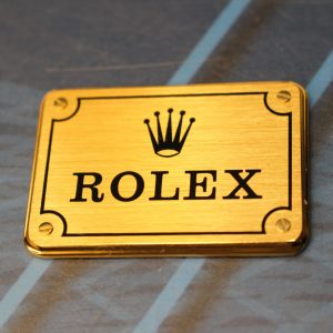 Rolex. Placa metal dorado. Logo, insignia. Original.
