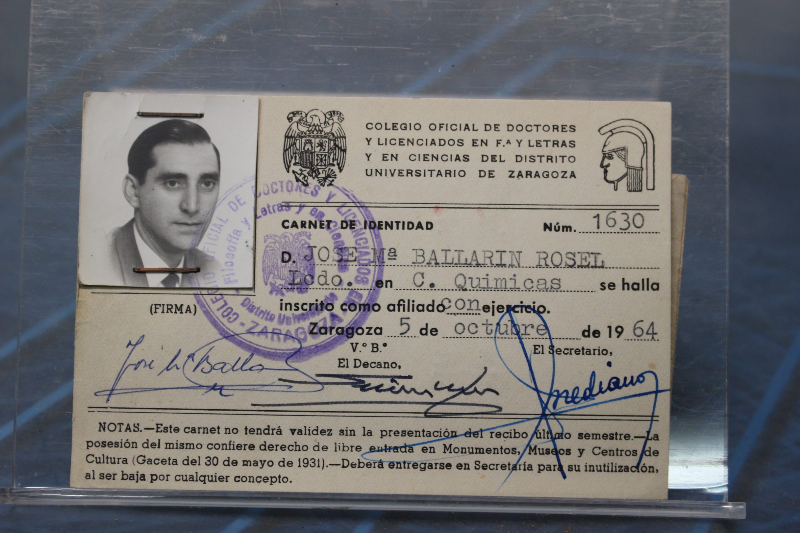 Universidad de Zaragoza, Carta de Identidad Escolar. 1941 + Carnet de Identidad del Colegio Oficial de Doctores y Licenciados en Filosofía y Letras. 1964.