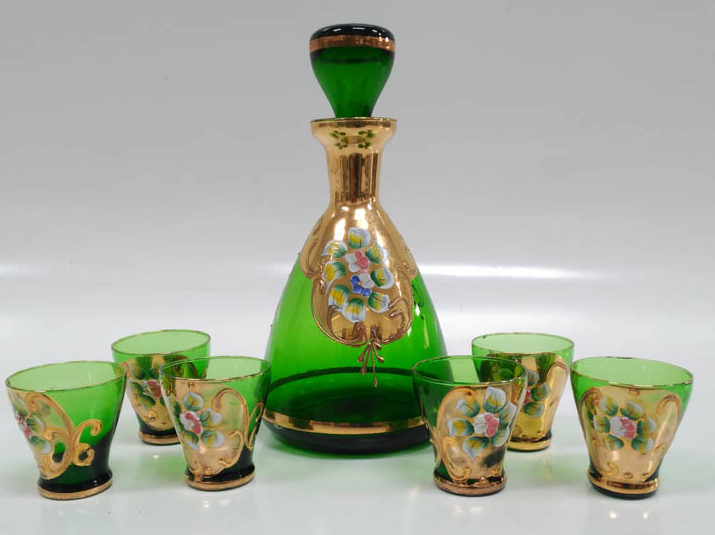 Conjunto botella y vasos cristal veneciano verde-dorado
